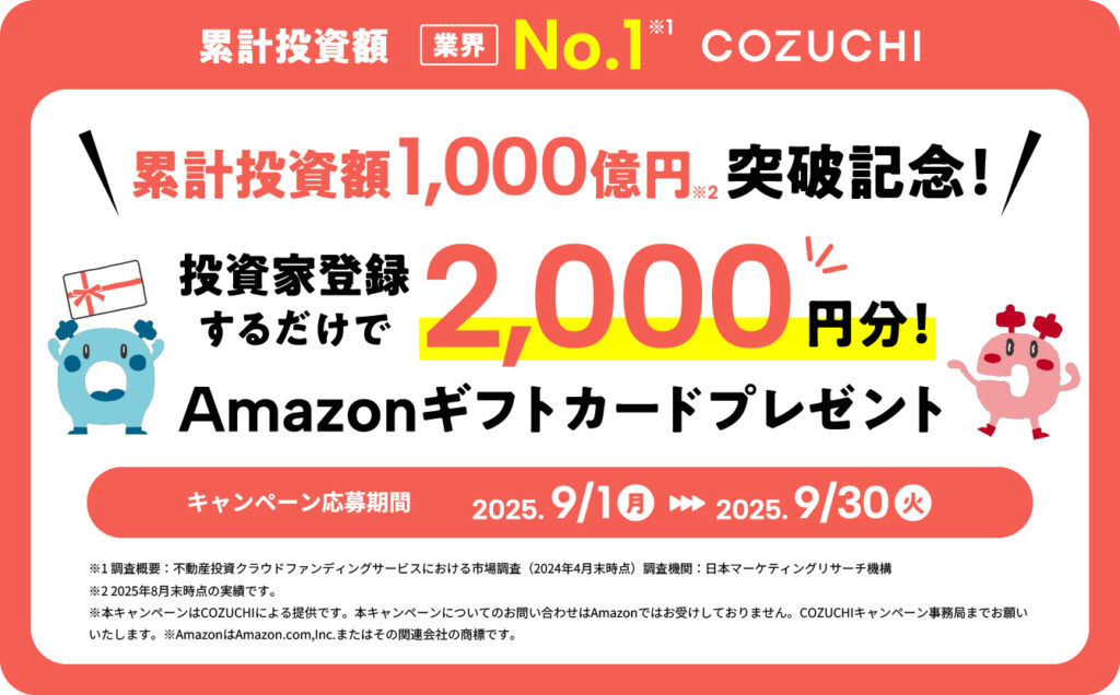 期間限定このブログから登録すると、Amazonギフト2,000円分がもらえる特別キャンペーンを開催中です。COZUCHIでは最近想定利回りが大幅に増えた案件がありました。