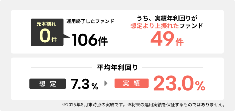 - 2021 年サービス開始以降、元本割れゼロ・償還 106 件(2025 年 8 月時点)